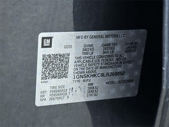 Enhanced Driver Alert Package (Automatic Emergency Braking, Forward Collision Alert, IntelliBeam w/Automatic High Beam On/Off, Lane Keep Assist w/Lane Departure Warning, and Safety Alert Seat), License Plate Front Mounting Package, Preferred Equipment Group 1LT (12-Volt Auxiliary Power Outlet (5), 1st & 2nd Row Color-Keyed Carpeted Floor Mats, 2nd Row 60/40 Split-Folding Manual Bench, 3rd Row Manual 60/40 Split-Folding Fold Flat Bench, 4-Wheel Antilock Disc Brakes, 6-Way Power Front Passenger Seat Adjuster, Auto-Dimming Inside Rear-View Mirror, Black Assist Steps, Bose Premium Audio System Feature, Color-Keyed Carpeting Floor Covering, Driver Inboard & Front Passenger Airbags, Electronic Cruise Control w/Set & Resume Speed, Extended-Range Remote Keyless Entry, Floor Console w/Storage Area, HD Radio, Leather-Wrapped Steering Wheel, Memory Settings, Power Liftgate, Power-Adjustable Accelerator & Brake Pedals, Rear Park Assist w/Audible Warning, Remote Vehicle Start, Roof-Mounted Luggage Rack Side Rails, SiriusXM Radio, and Universal Home Remote), Premium Smooth Ride Suspension Package, 18" x 8.5" High-Polished Aluminum Finish Wheels, 3.08 Rear Axle Ratio, 3rd row seats: split-bench, 4-Wheel Disc Brakes, 9 Speakers, ABS brakes, Adjustable pedals, Air Conditioning, Alloy wheels, AM/FM radio: SiriusXM, Apple CarPlay/Android Auto, Auto High-beam Headlights, Auto-dimming Rear-View mirror, Automatic temperature control, Brake assist, Bumpers: body-color, CD player, Compass, Delay-off headlights, Driver door bin, Driver vanity mirror, Dual front impact airbags, Dual front side impact airbags, Electronic Stability Control, Emergency communication system: OnStar and Chevrolet connected services capable, Exterior Parking Camera Rear, Front anti-roll bar, Front Bucket Seats, Front Center Armrest, Front dual zone A/C, Front reading lights, Front wheel independent suspension, Fully automatic headlights, Garage door transmitter, Heated door mirrors, Heated Front Reclining Bucket Seats, Heated front seats, Illuminated entry, Leather steering wheel, Leather-Appointed Seat Trim, Low tire pressure warning, Memory seat, Occupant sensing airbag, Outside temperature display, Overhead airbag, Overhead console, Panic alarm, Passenger door bin, Passenger vanity mirror, Pedal memory, Power door mirrors, Power driver seat, Power passenger seat, Power steering, Power Tilt-Sliding Sunroof w/Express-Open/Close, Power windows, Radio: AM/FM Stereo w/Chevrolet Infotainment, Rain sensing wipers, Rear air conditioning, Rear anti-roll bar, Rear reading lights, Rear seat center armrest, Rear window defroster, Rear window wiper, Remote keyless entry, Security system, Single-Slot CD/MP3 Player, Speed control, Speed-sensing steering, Split folding rear seat, Spoiler, Steering wheel mounted audio controls, Tachometer, Telescoping steering wheel, Tilt steering wheel, Traction control, Trip computer, Variably intermittent wipers, and Voltmeter.