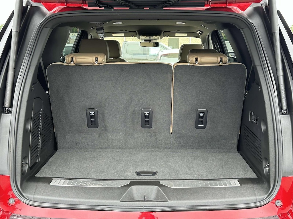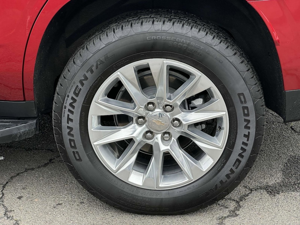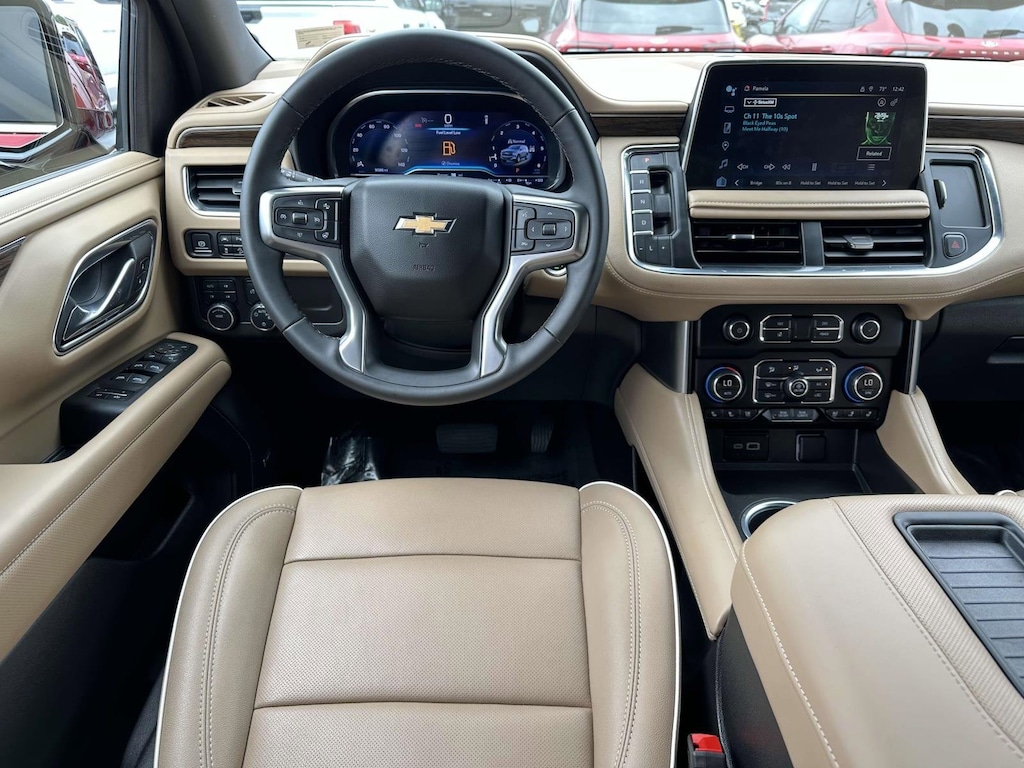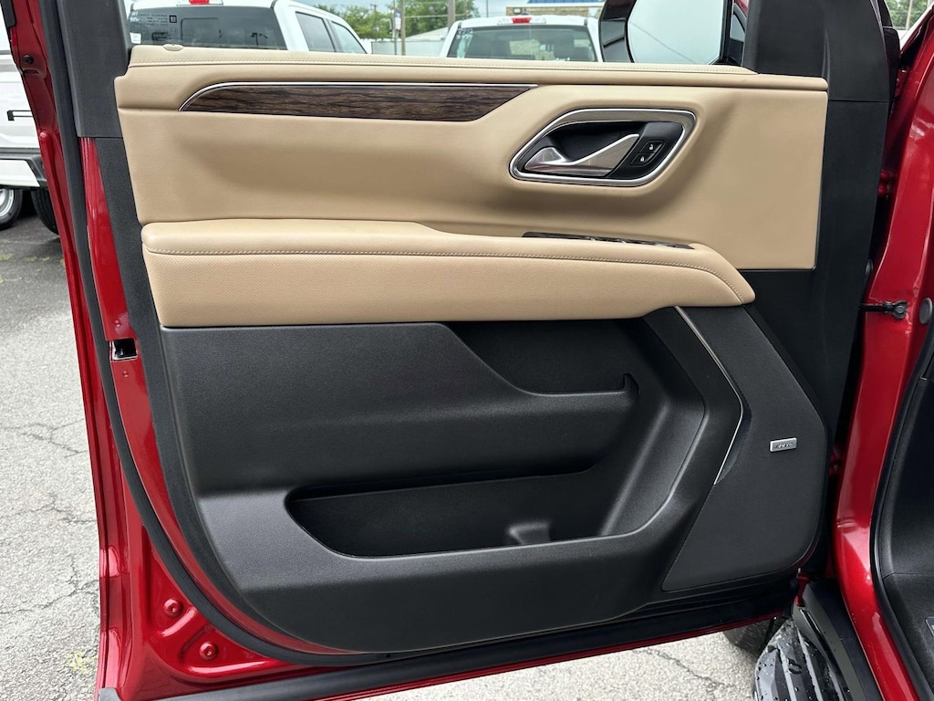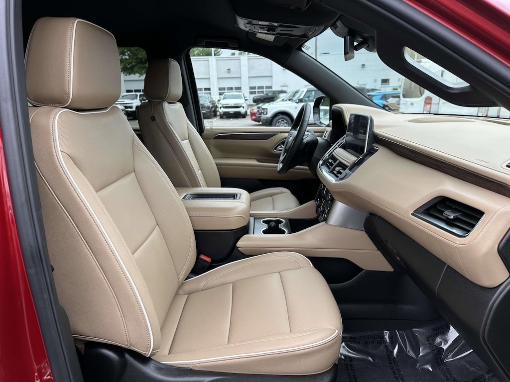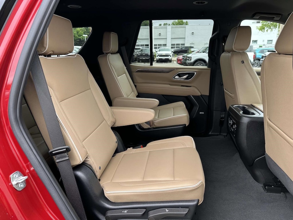 License Plate Front Mounting Package, Preferred Equipment Group 1LZ (1st & 2nd Row Color-Keyed Carpeted Floor Mats, 2-Speed Active Electronic AutoTrac Transfer Case, 3rd Row 60/40 Power-Folding Split-Bench Seat, Auto-Dimming Inside Rear-View Mirror, Bose 10-Speaker Centerpoint Surround Audio Sys Ft, Bright Front & Rear Door Sill Plates, Chrome Door Handles w/Body-Color Strip, Chrome Mirror Caps, Color-Keyed Carpeting Floor Covering, Driver & Front Outboard Passenger Airbags, Dual Exhaust System, Enhanced Driver Information Center, Floor Console, Hands-Free Rear Power Programmable Liftgate, Heated 2nd Row Outboard Seats, Heated Steering Wheel, Hill Descent Control, Lane Change Alert w/Side Blind Zone Alert, LED Daytime Running Lamps, Memory Settings, Outside Heated Power-Adjustable Mirrors, Power Release 2nd Row Bucket Seats, Power Tilt & Telescopic Steering Column, Rear Cross Traffic Alert, Remote Start, Safety Alert Seat, SiriusXM w/360L, Universal Home Remote, Wireless Charging, and Wrapped Steering Wheel), 4WD, Jet Black/Maple Sugar Leather, Navigation System, 10 Speakers, 12-Way Power Driver & Passenger Seat Adjusters, 20 x 9 Polished Aluminum Wheels, 3.23 Rear Axle Ratio, 3rd row seats: split-bench, 4-Wheel Disc Brakes, ABS brakes, Adaptive suspension, Air Conditioning, Alloy wheels, AM/FM radio: SiriusXM with 360L, Apple CarPlay/Android Auto, Auto High-beam Headlights, Auto-dimming door mirrors, Auto-dimming Rear-View mirror, Auto-leveling suspension, Automatic temperature control, Brake assist, Bumpers: body-color, Compass, Delay-off headlights, Driver & Front Passenger Heated & Ventilated Seats, Driver door bin, Driver vanity mirror, Dual front impact airbags, Dual front side impact airbags, Electronic Stability Control, Emergency communication system: OnStar and Chevrolet connected services capable, Four wheel independent suspension, Front anti-roll bar, Front Bucket Seats, Front Center Armrest, Front dual zone A/C, Front High-Back Reclining Bucket Seats, Front reading lights, Fully automatic headlights, Garage door transmitter, Heated door mirrors, Heated Driver & Front Passenger Seats, Heated front seats, Heated rear seats, Heated steering wheel, Illuminated entry, Infotainment Display, Low tire pressure warning, Magnetic Ride Control Suspension, Memory seat, Occupant sensing airbag, Outside temperature display, Overhead airbag, Overhead console, Panic alarm, Passenger door bin, Passenger vanity mirror, Perforated Leather Seat Trim, Power door mirrors, Power driver seat, Power Liftgate, P
