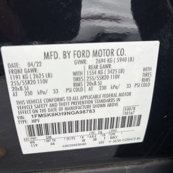 Recent Arrival! Equipment Group 250A, 12 Speakers, 1st Row Heated Seats, 20" Machined Aluminum w/Painted Pockets Wheels, 3.58 Non-Limited-Slip Rear Axle Ratio, 3rd row seats: bench, 4-Wheel Disc Brakes, ABS brakes, ActiveX Captain's Chairs w/Miko Inserts, Air Conditioning, Alloy wheels, AM/FM radio: SiriusXM, Auto High-beam Headlights, Auto Start-Stop Removal, Auto-dimming Rear-View mirror, Automatic temperature control, Black Roof-Rack Side Rails, Brake assist, Bumpers: body-color, Compass, Delay-off headlights, Driver door bin, Driver vanity mirror, Dual front impact airbags, Dual front side impact airbags, Electronic Stability Control, Emergency communication system: SYNC 3 911 Assist, Exterior Parking Camera Rear, FordPass Connect, Four wheel independent suspension, Front & Second Row Floor Liners (16B), Front anti-roll bar, Front Bucket Seats, Front Center Armrest, Front dual zone A/C, Front fog lights, Front reading lights, Fully automatic headlights, Heated door mirrors, Heated front seats, Heated steering wheel, Illuminated entry, Knee airbag, Leather steering wheel, Low tire pressure warning, Navigation System, Occupant sensing airbag, Outside temperature display, Overhead airbag, Overhead console, Panic alarm, Passenger door bin, Passenger vanity mirror, Power door mirrors, Power driver seat, Power Liftgate, Power passenger seat, Power steering, Power windows, Radio data system, Radio: B&O Sound System by Bang & Olufsen, Rain sensing wipers, Rear air conditioning, Rear anti-roll bar, Rear Auxiliary Controls Credit, Rear reading lights, Rear window defroster, Rear window wiper, Remote keyless entry, Security system, Speed control, Speed-sensing steering, Speed-Sensitive Wipers, Split folding rear seat, Spoiler, Steering wheel mounted audio controls, SYNC 3 Communications & Entertainment System, SYNC 3/Apple CarPlay/Android Auto, Tachometer, Telescoping steering wheel, Tilt steering wheel, Traction control, Trip computer, Twin Panel Moonroof, Variably intermittent wipers, and Voice-Activated Touchscreen Navigation System.